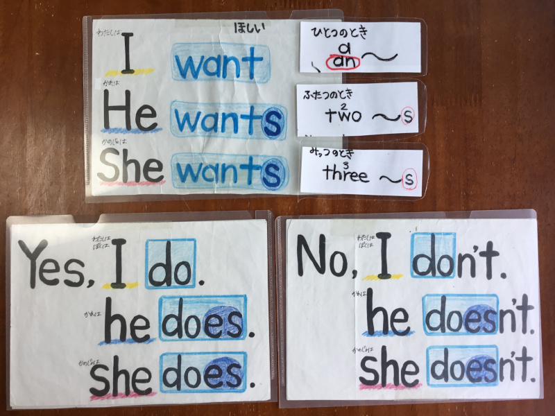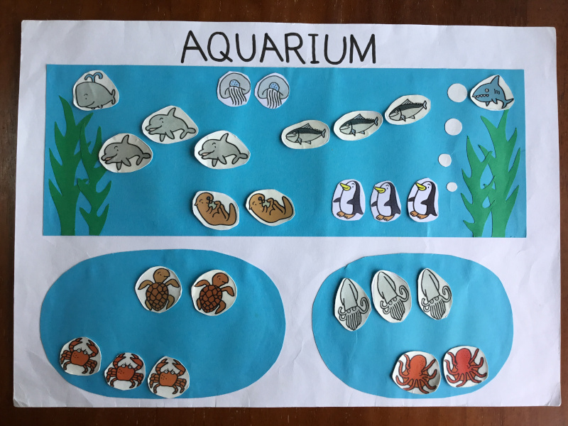 子どもたち同士で英語の質問をし合い、お互いに欲しいものを伝え合います。単数形や複数形、三単現のSなどに注意しながら表現を磨き、クラス全員で力を合わせて水族館を完成させます!